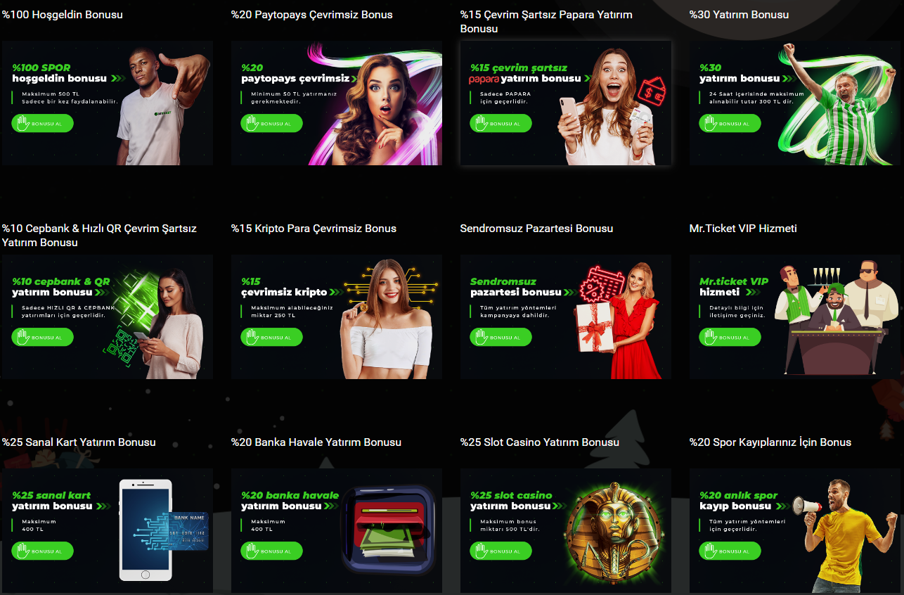 Spor bahislerine ve casino oyunlarına ilk üyelik bonusu veren siteler arasındadır. Yani yeni üyeler ilk yatırımlara bağlı olarak karşılama bonusu kazanıyor. Bunun için %100 değerinden hesaplamalara geçilmektedir. Beraberinde bonusları kurallara göre değerlendiren kullanıcılar kazanç sağlıyor. Yine kurallara göre sunulan diğer bonuslar ise; [tie_list type="starlist"]